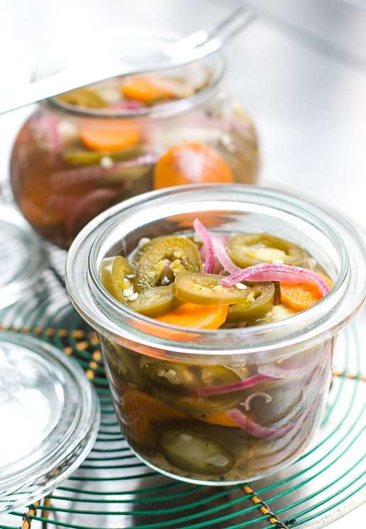 - Add the jalapeños, carrots, and onions. Let cook in the pan for 1 minute, then cover, remove from heat, and let stand 15 minutes.