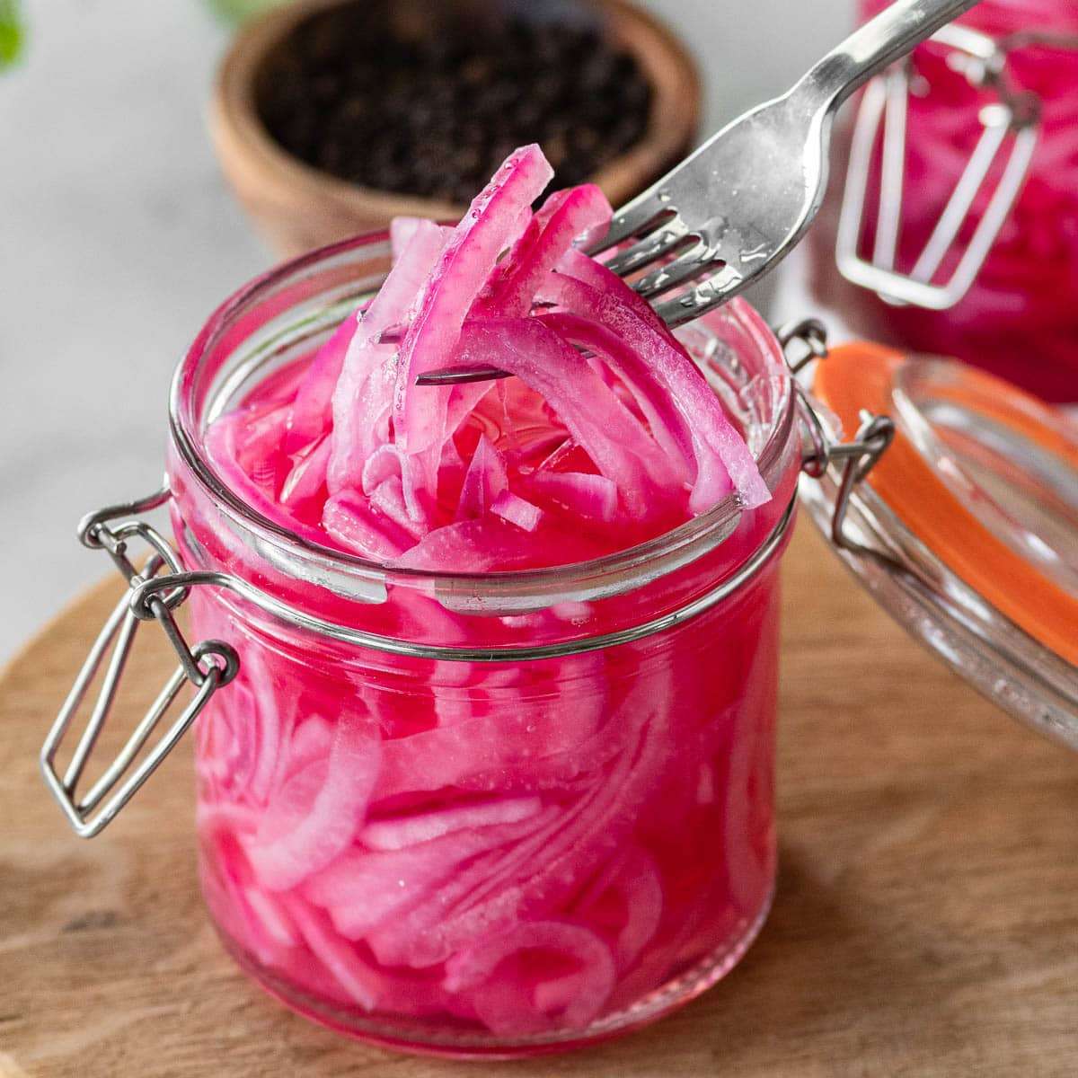 Pickled Red Onions are so easy to make with salt, sugar, peppercorns, and white wine. Perfect to use for tacos, salads, or sandwiches.