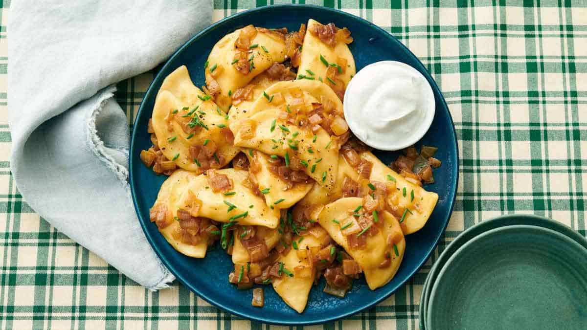 These homemade Pierogis are a delicious delicacy–the pillowy dough is stuffed with a cheese and potato filling and topped with caramelized onions. Tender on the inside with a golden crunch on the outside, they make the perfect main dish, starter, or side dish.