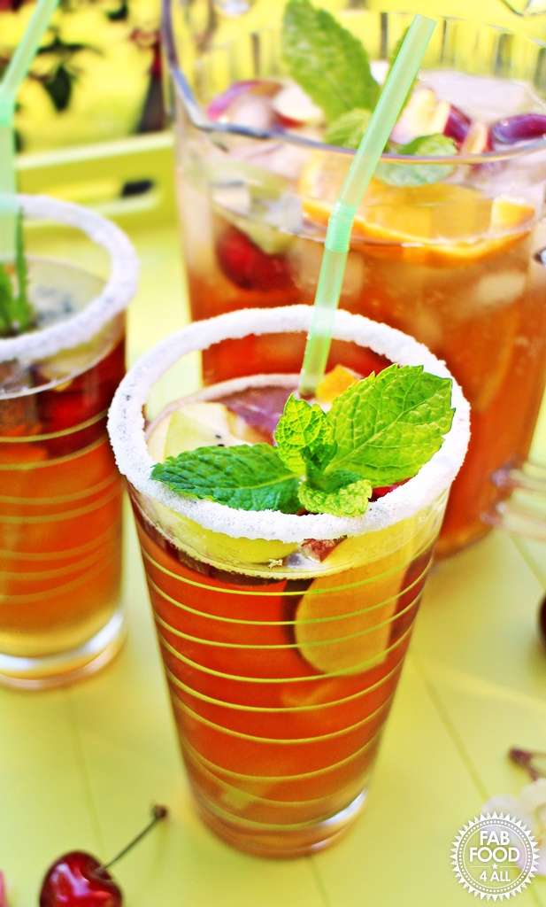 Pimm's No.1 & Lemonade is a classic, here I give it my own twist with cherries, apple, kiwi fruit and orange in a frosted glass for the perfect summer party drink!