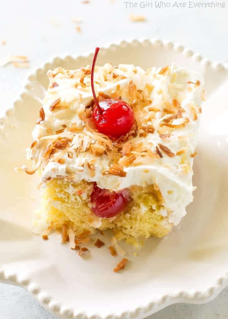 This Pina Colada Poke Cake is drizzled with coconut sauce, crushed pineapple and topped with coconut whipped cream and toasted coconut.