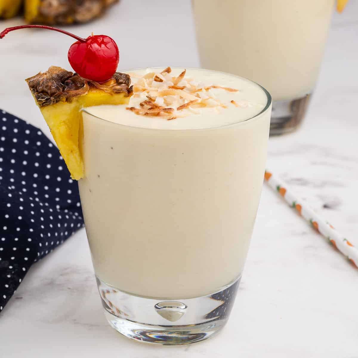 - Serving suggestions: Pour into a glass and top your smoothie with a maraschino cherry and sprinkle of toasted coconut. Pineapple wedges make a great garnish here too!