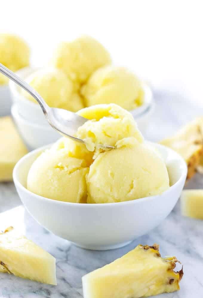 Creamy pineapple and coconut sorbet with a hint of rum is the perfect end of summer treat!