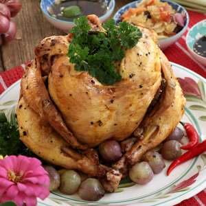 - Place the chicken on top of the banana leaves in a sitting position. You can insert a small ramekin or a small empty can on the opening of the cavity to help the chicken stay in position.