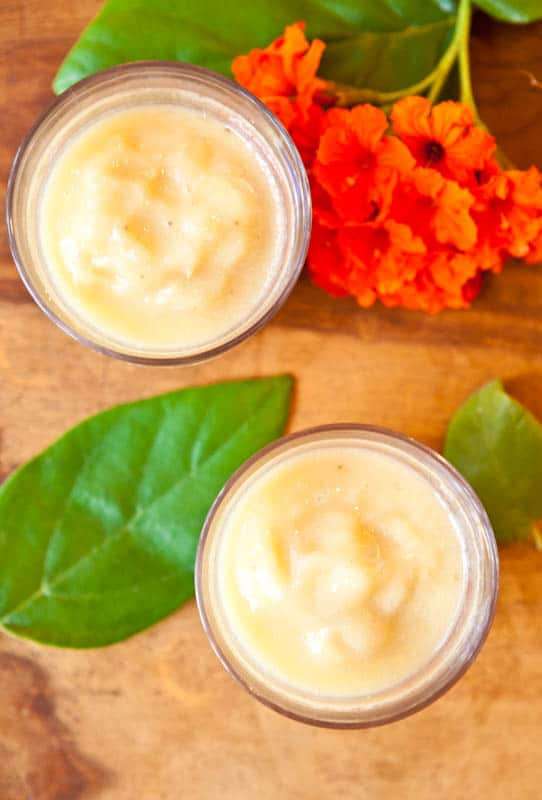 Tastes like a virgin pina colada. Sweet, creamy, refreshing, and healthy. The smoothie is vegan, gluten-free, and there’s no need to add sugar since the fruit is sweet enough. Packed with potassium and Vitamin C to help keep germs at bay!