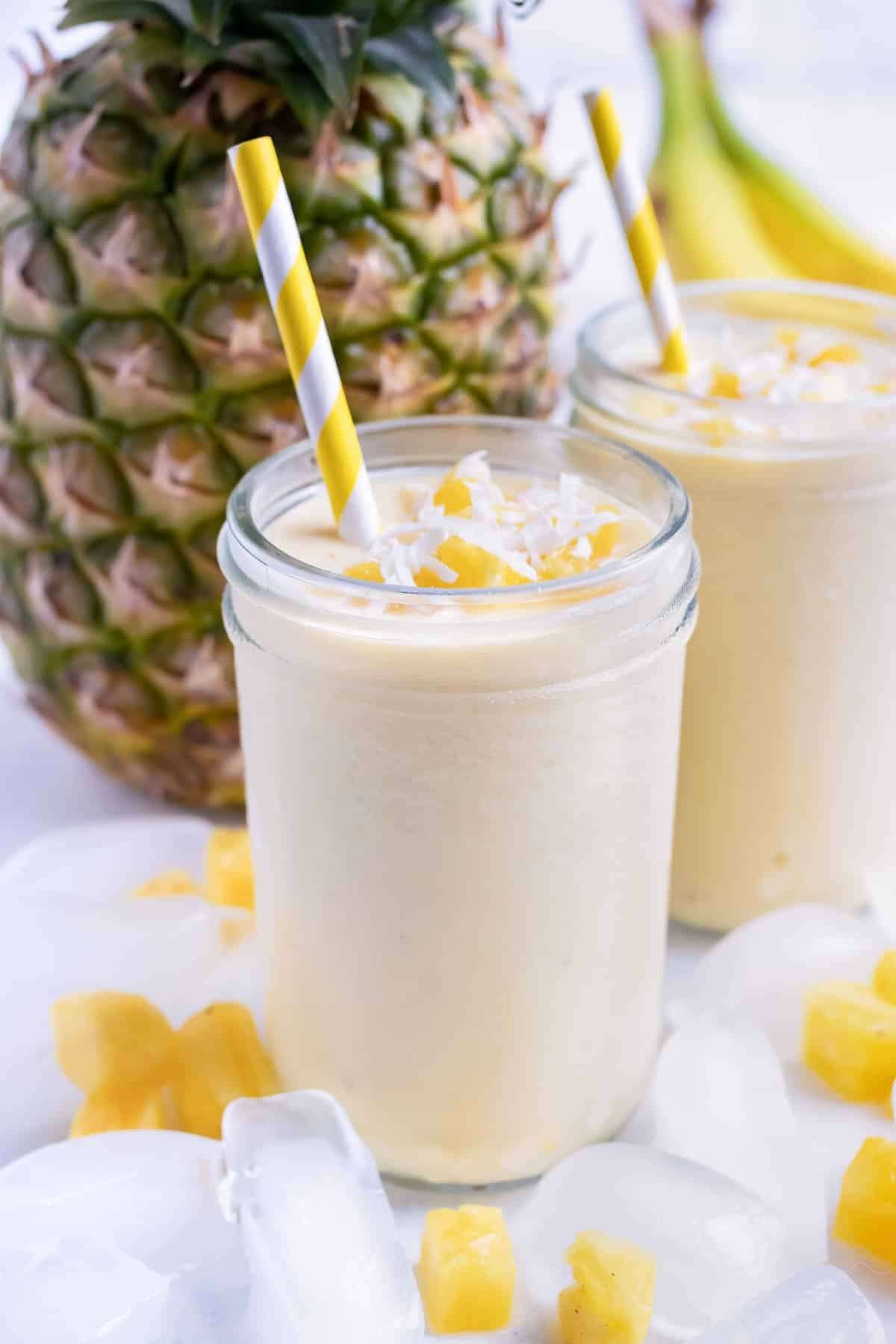 - Blend for 1-2 minutes or until smooth and creamy. Serve with diced pineapple, shredded coconut, and a straw.