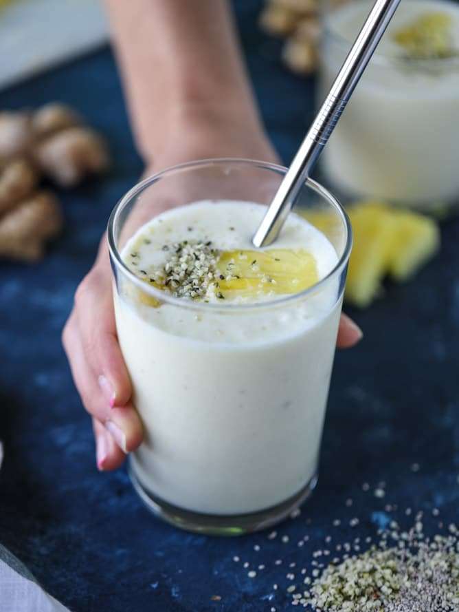 - Combine all the ingredients together in a blender and… BLEND! Easy peasy. You can top with a fresh pineapple ring or chunk if desired.