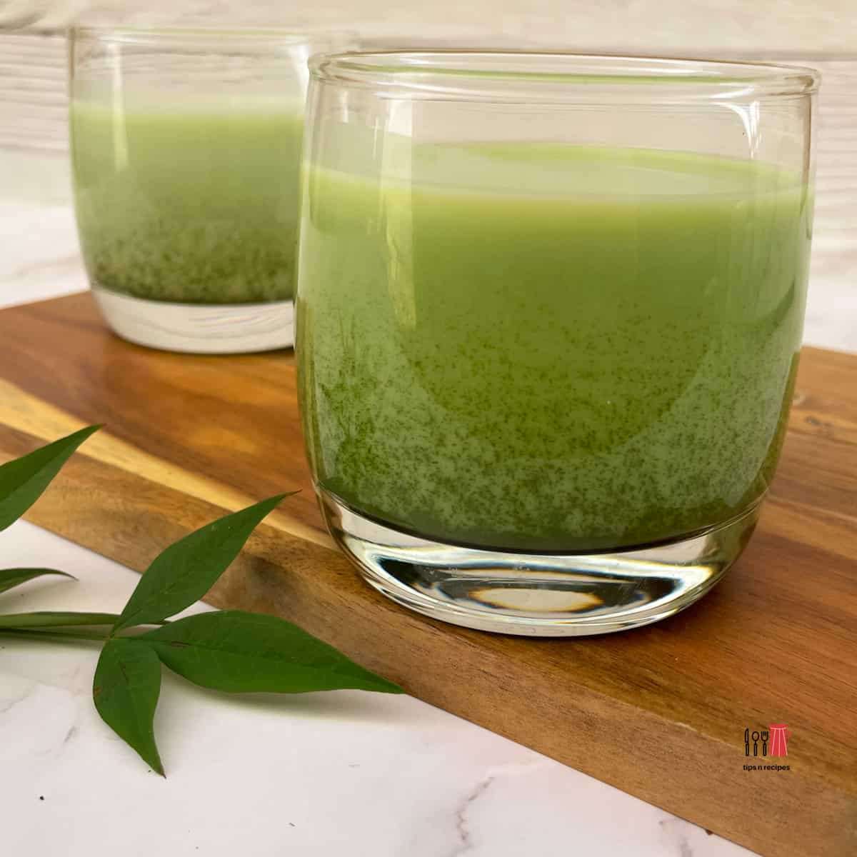 - Pour matcha powder into a glass, and dissolve in pineapple juice with the help of a spoon.