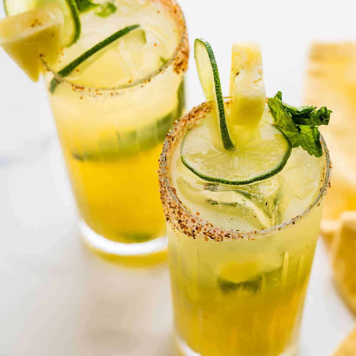 - Garnish with a slice of pineapple, lime, or mint (or all three).
