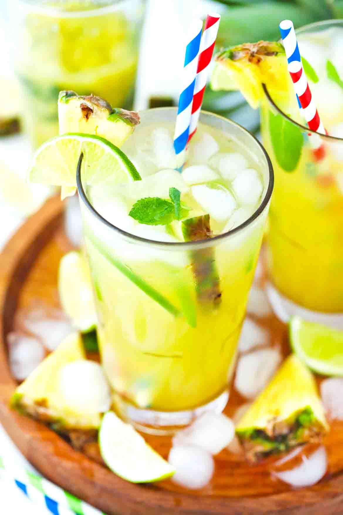 - Garnish with fresh mint sprigs, and lime wedges pieces of fresh pineapple.