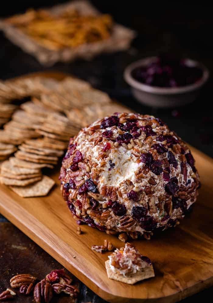 - Remove the cheese ball from the plastic wrap and roll it into the pecan/cranberry mixture.
