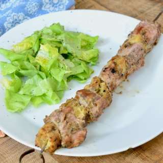 - Place the assembled skewers on the preheated grill pan. Cook for about 4 minutes per side or about 8 minutes total. Turn as necessary to cook pork evenly. Baste with half of the remaining extra marinade while grilling if desired.