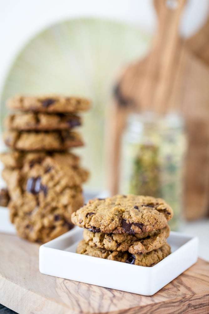 An easy Pistachio Cookies recipe with pistachio butter as the main ingredient and chocolate chunks for extra good flavor! Vegan, Gluten Free, Refined Sugar Free.