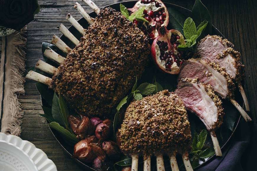 - Stir pistachios, bread crumbs, butter, olive oil, and a pinch of salt and black pepper in a bowl. Spread mustard on the fat-side of each rack of lamb. Pat pistachio mixture on top of mustard. Bake in the preheated oven until the crust is golden and lamb is pink in the center, 20 to 25 minutes. Transfer to a plate and let rest 10 minutes before slicing.