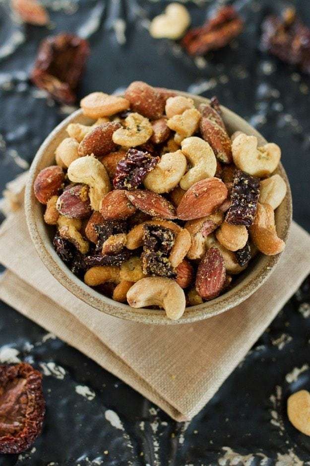 A savory mix of roasted nuts with sun-dried tomatoes and Italian seasonings, this Pizza Trail Mix is the ultimate snack. Vegan, gluten-free and paleo-friendly.