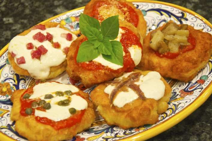 - Now it's time to get creative. You place these little fried pizza rounds on a cookie sheet and top them with whatever strikes your fancy—basically anything you'd put on a pizza, you can put on a pizzetta. A fried pizza round can also be made in bianco (without tomato) with cheese or other toppings.