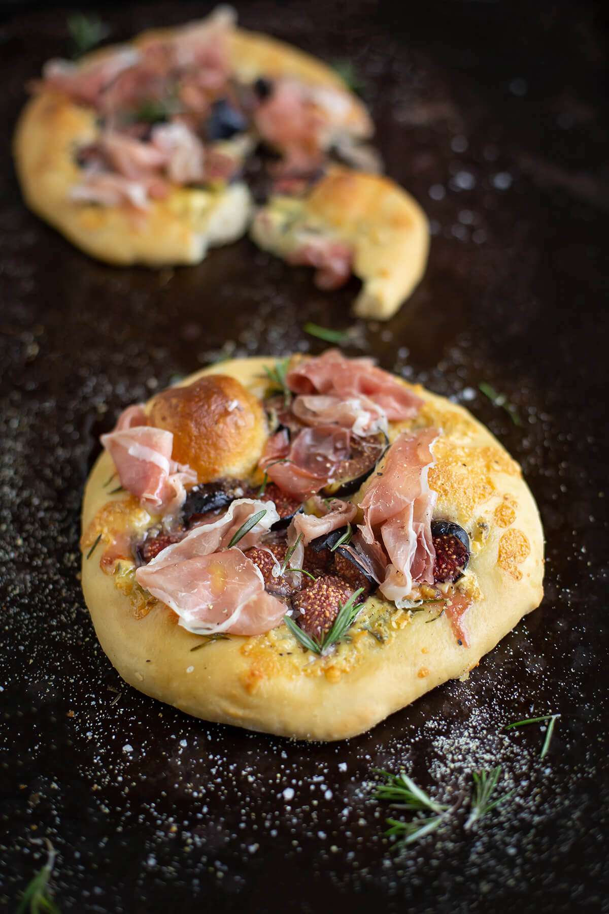 A recipe for mini pizzas or pizzette with creamy blue cheese, figs and prosciutto.
