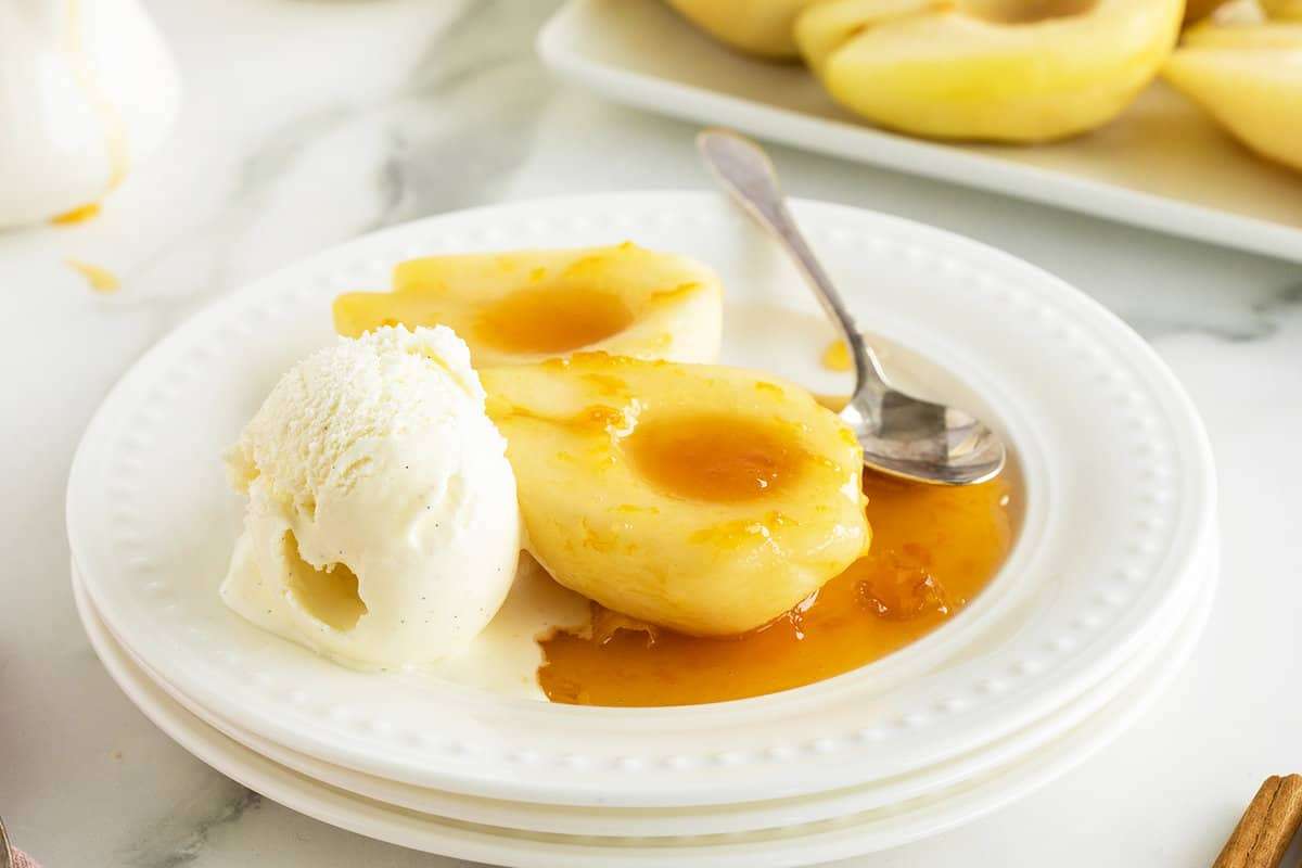 - To serve this add one or two slices of pear on a plate and pour the sauce over top. Serve with a small scoop of vanilla ice cream on the side.