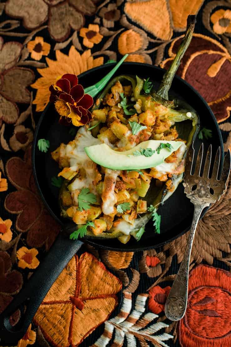 - Arrange poblano peppers in a casserole dish and fill each with the chorizo and chayote mixture.