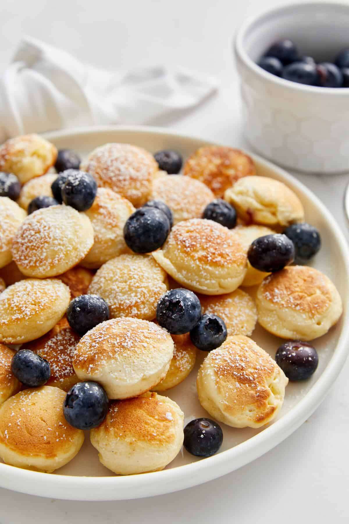 - Transfer the poffertjes to a plate. Repeat with remaining batter. Serve warm with fresh fruit or a light dusting of powdered sugar.