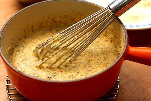- Remove from heat and whisk in the cheese, herbs (if using), and butter.