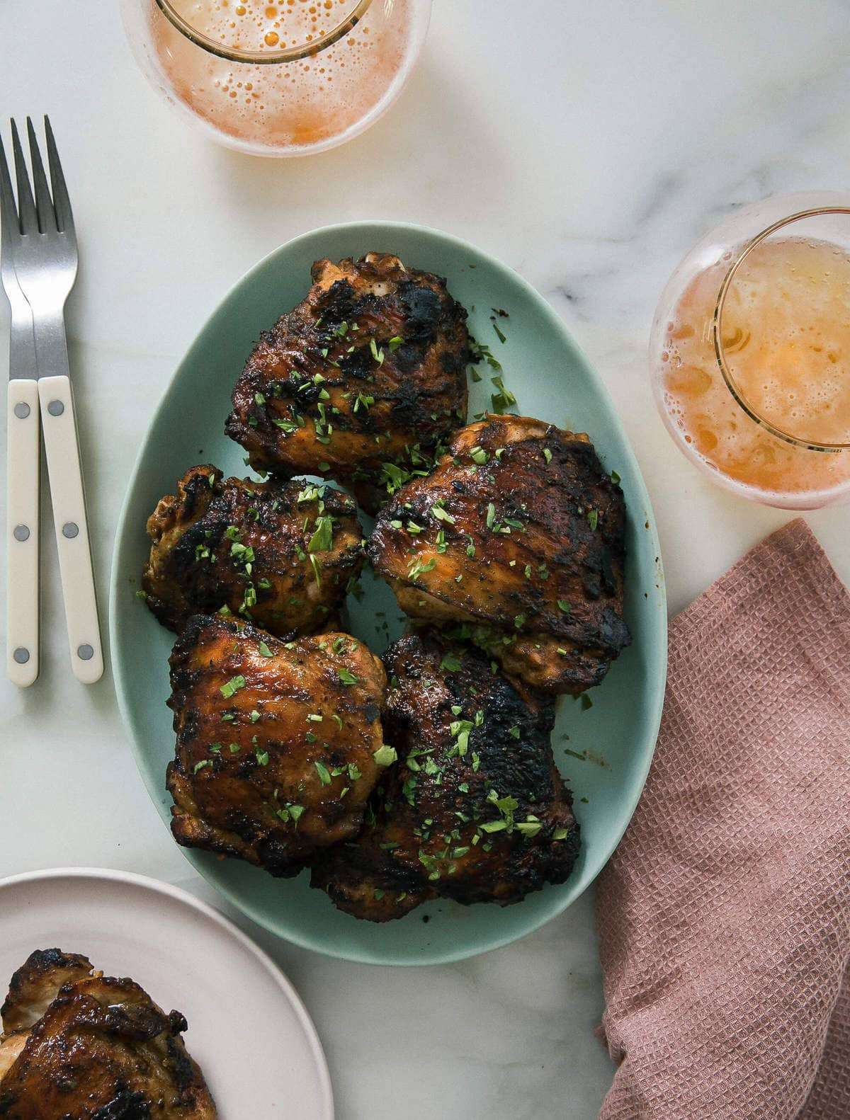 Pollo a la Brasa-Style Grilled Chicken Thighs marinated in a combination of soy sauce, ginger, pepper, and spices. This Peruvian favorite is adapted for your home grill.
