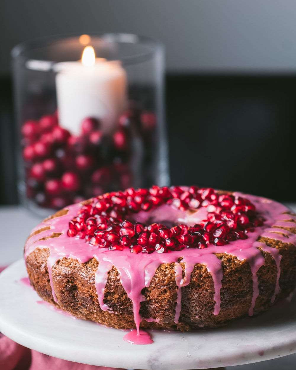 - Allow the cake to rest until it is cool enough to touch. Then, carefully invert it onto a cooling rack. Then drizzle with the Pomegranate Glaze and serve.
