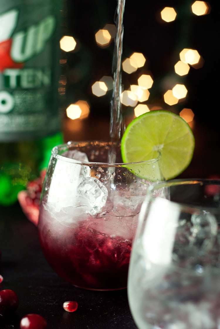 - In a highball glass filled with ice, add the pomegranate juice, followed by the 7UP TEN and fresh lime juice. Gently stir and enjoy!