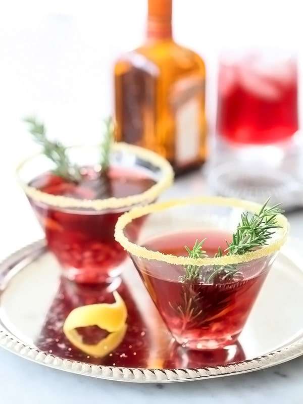 - Combine the vodka, orange liqueur, pomegranate juice, and lemon juice in a pitcher and refrigerate until ready to use. Dip the rims of the martini glasses in a shallow bowl with ¼ inch of water then roll the rims in gold sugar. Fill martini glasses with pomegranate mixture, a tablespoon of pomegranate seeds, lemon twists, and garnish with rosemary sprigs. Serve over ice if desired.