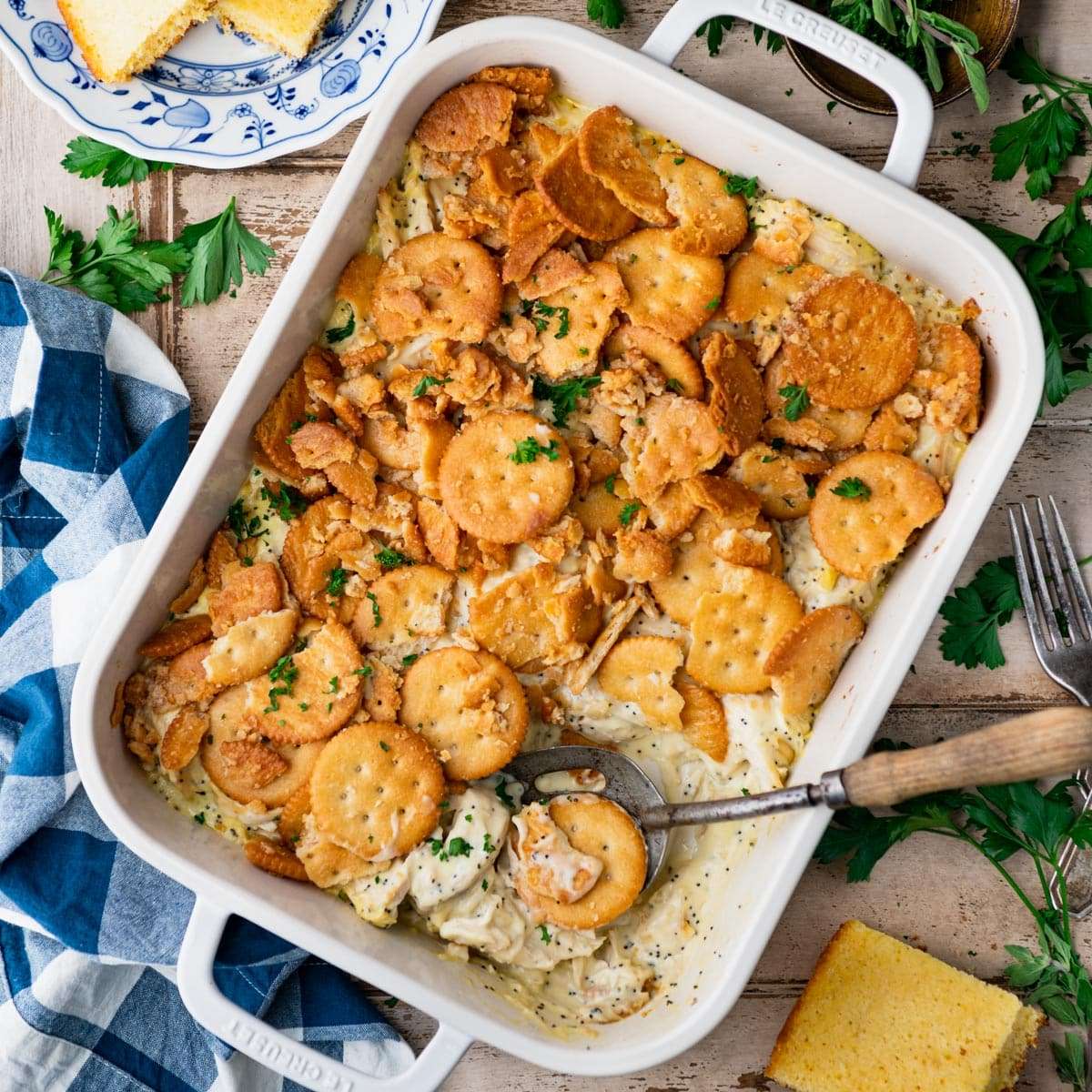 This creamy poppy seed chicken casserole with almonds and buttery Ritz crackers is an easy dinner with just 10 minutes of prep!