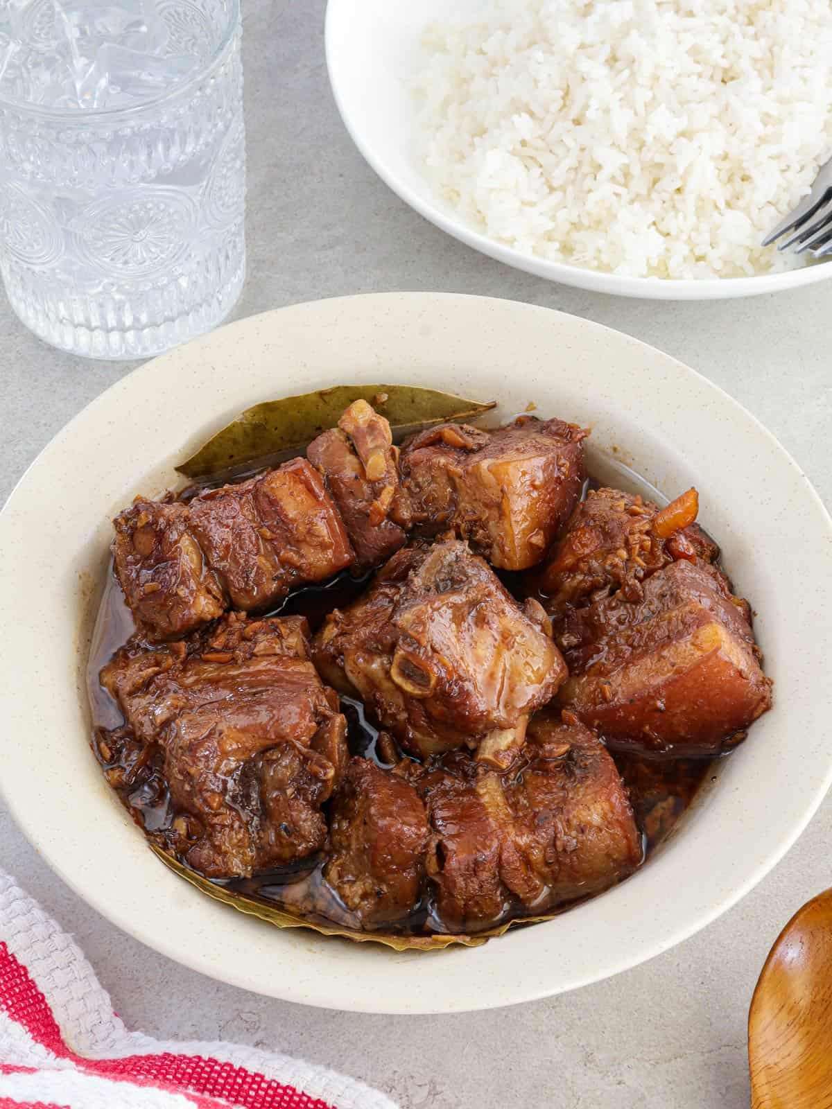 Filipino Adobo made with pork belly is a delicious medley of salty and savory you'll love with steamed rice. It's easy to make, hearty, tasty, and sure to be a dinner favorite!