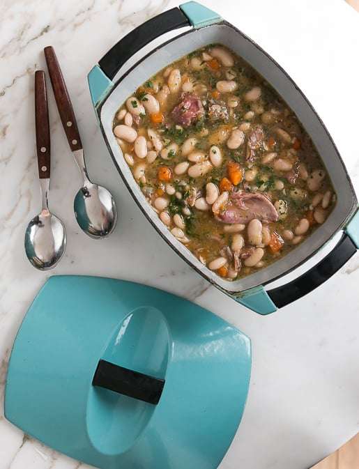 - Serving: Remove the hocks from the beans and set them on a plate. When cool enough to handle, shred the meat from the bones, discarding the bones and skin, and add the pieces of pork back to the beans. Rewarm the pork and beans together, then ladle into serving bowls. Top with aillade, pesto, or chopped parsley, if desired.