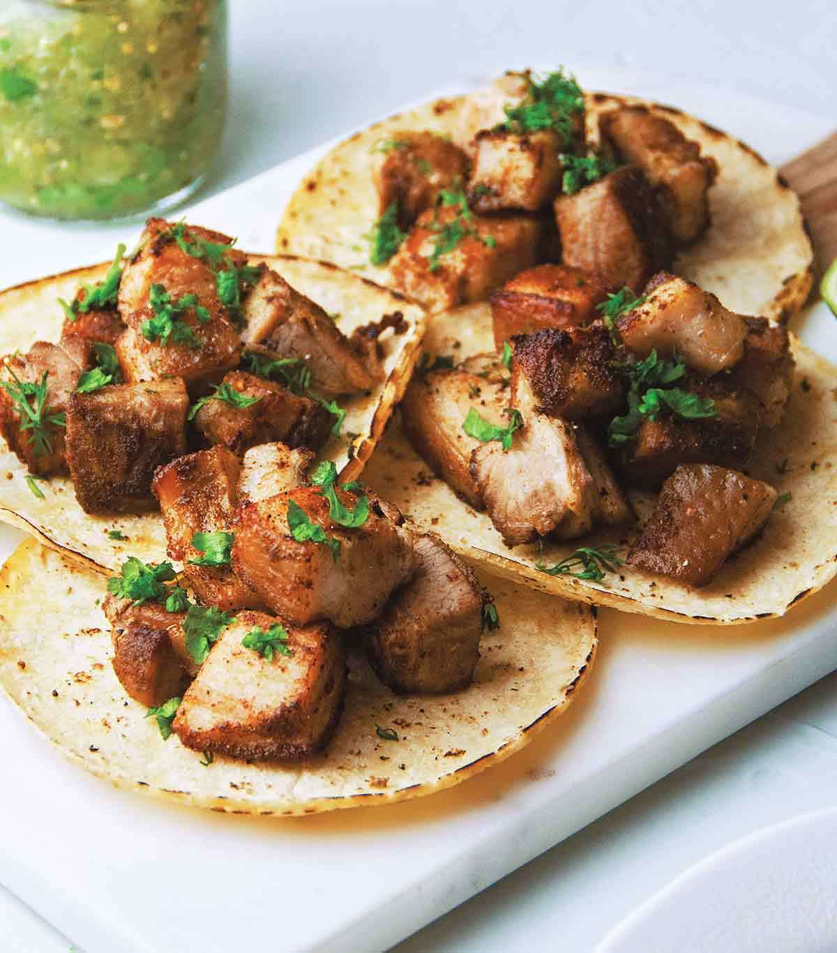 These pork belly tacos are made with slow-roasted spiced pork belly that's cubed and fried until crispy. Not your average Taco Tuesday.