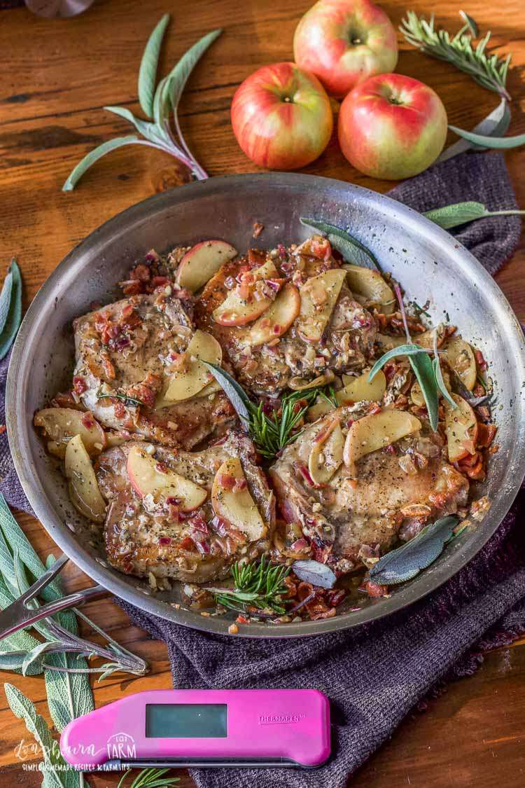 - Add the pork chops back in, along with any accumulated juices, cook until final temperature is at least 145º, up to 160º for well done pork chops. Top with bacon and spoon apples and sauce over the top.