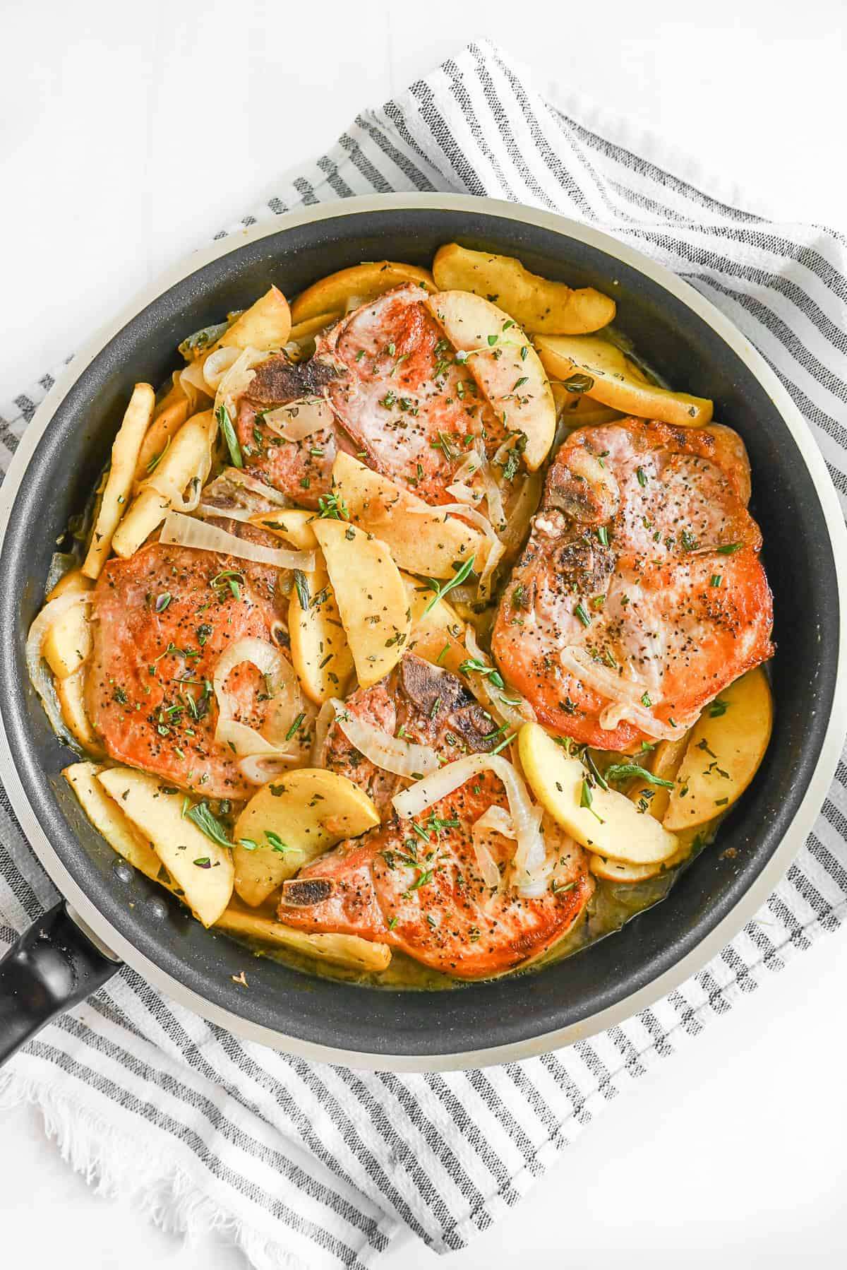- Add the pork chops back into the pan (with their drippings!) and nestle them among the apples and onions.