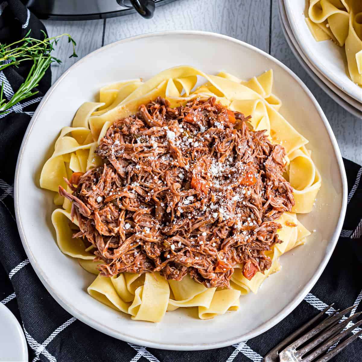 Italian flavors shine in this slow cooker Pork Ragu recipe. Cooked for hours in the crockpot in an herb infused wine sauce, the juicy, shredded pork is served over pappardelle pasta for an irresistible Italian dinner.