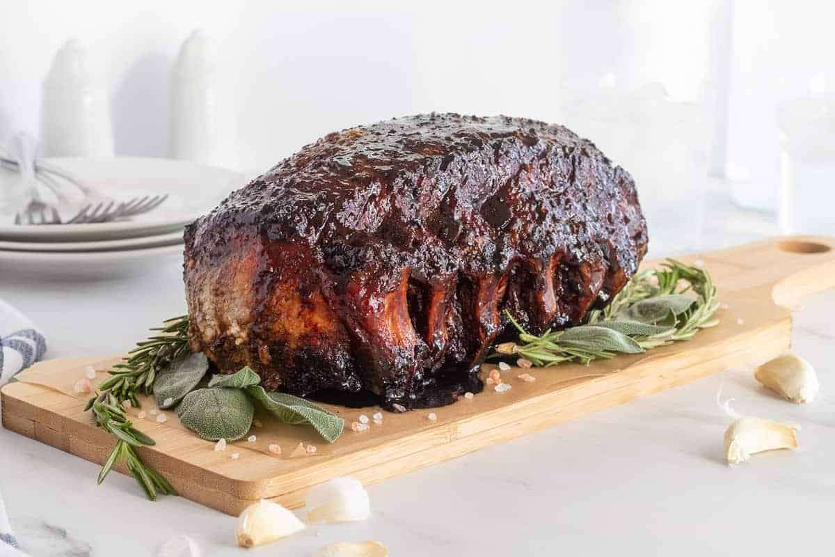 Pork rib roast is cooked to tender perfection and glazed with a sweet and spice glaze. Perfect for Sunday dinner!