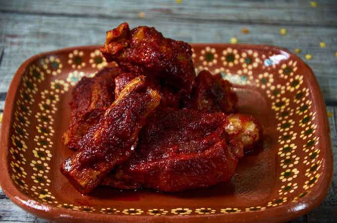 Mexican style slow-simmered pork ribs in a mild guajillo salsa roja popular around Aguascalientes. The sauce is like a tangy chile based BBQ sauce, familiar and a bit exotic at the same time.