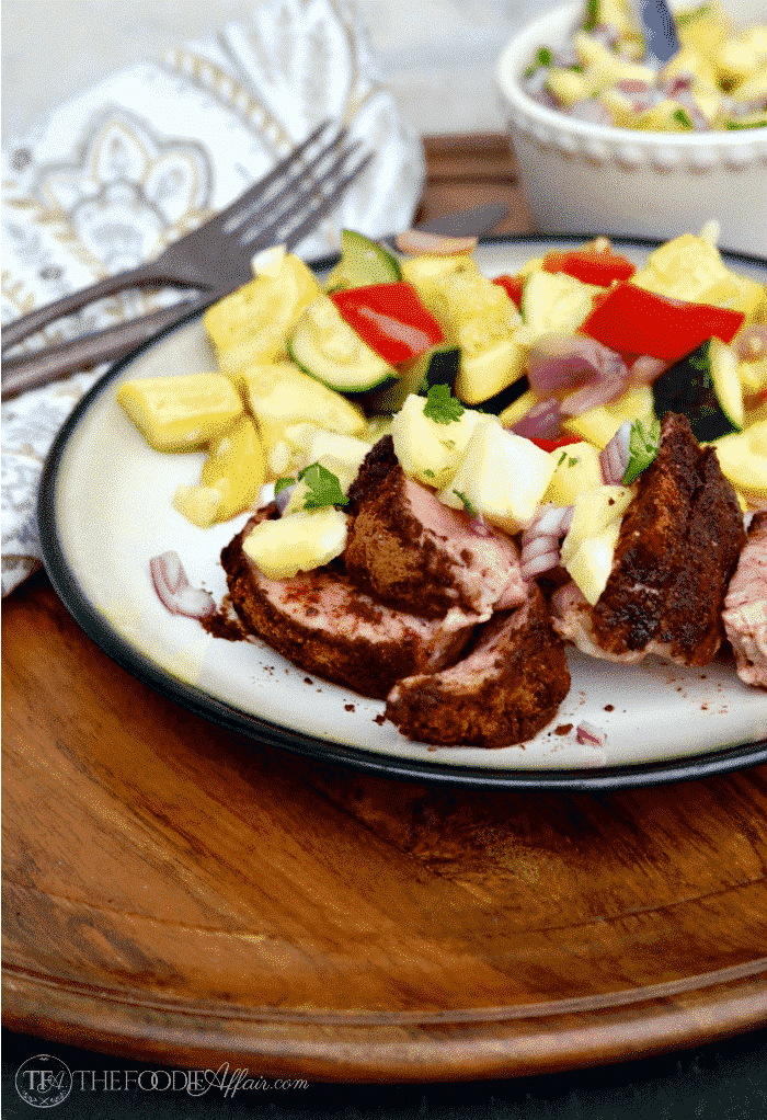 Tender pork tenderloin with pineapple salsa is a delicious contract with the cocoa dry rub. The simple fruity salsa can also me used on chicken or beef.