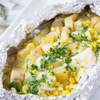 - Cut six sheets of foil, about 12-inches long. Divide potato mixture into 6 equal portions, about 1 cup per foil packet, and add to the center of each foil in a single layer.