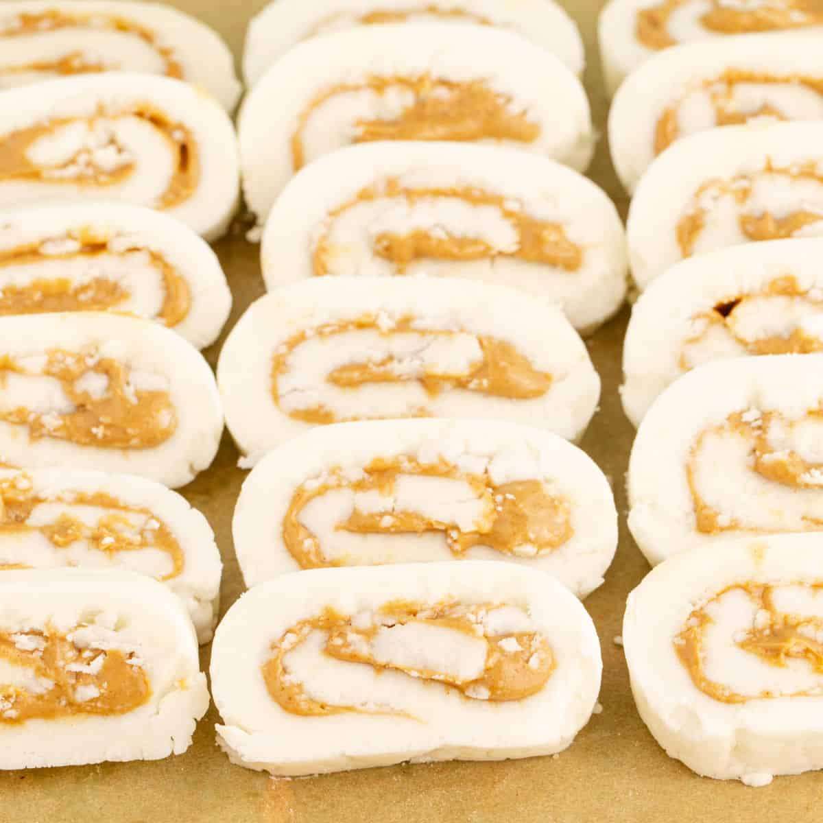 - Spread the peanut butter evenly over the dough, leaving a 1-inch along one of the long sides. Spread the peanut butter all the way to the edges of the other 3 sides. Then, starting with long with peanut butter, roll the dough up tightly into a log ending seam side down. Trim off any excess on the ends so you start with a nice edge.