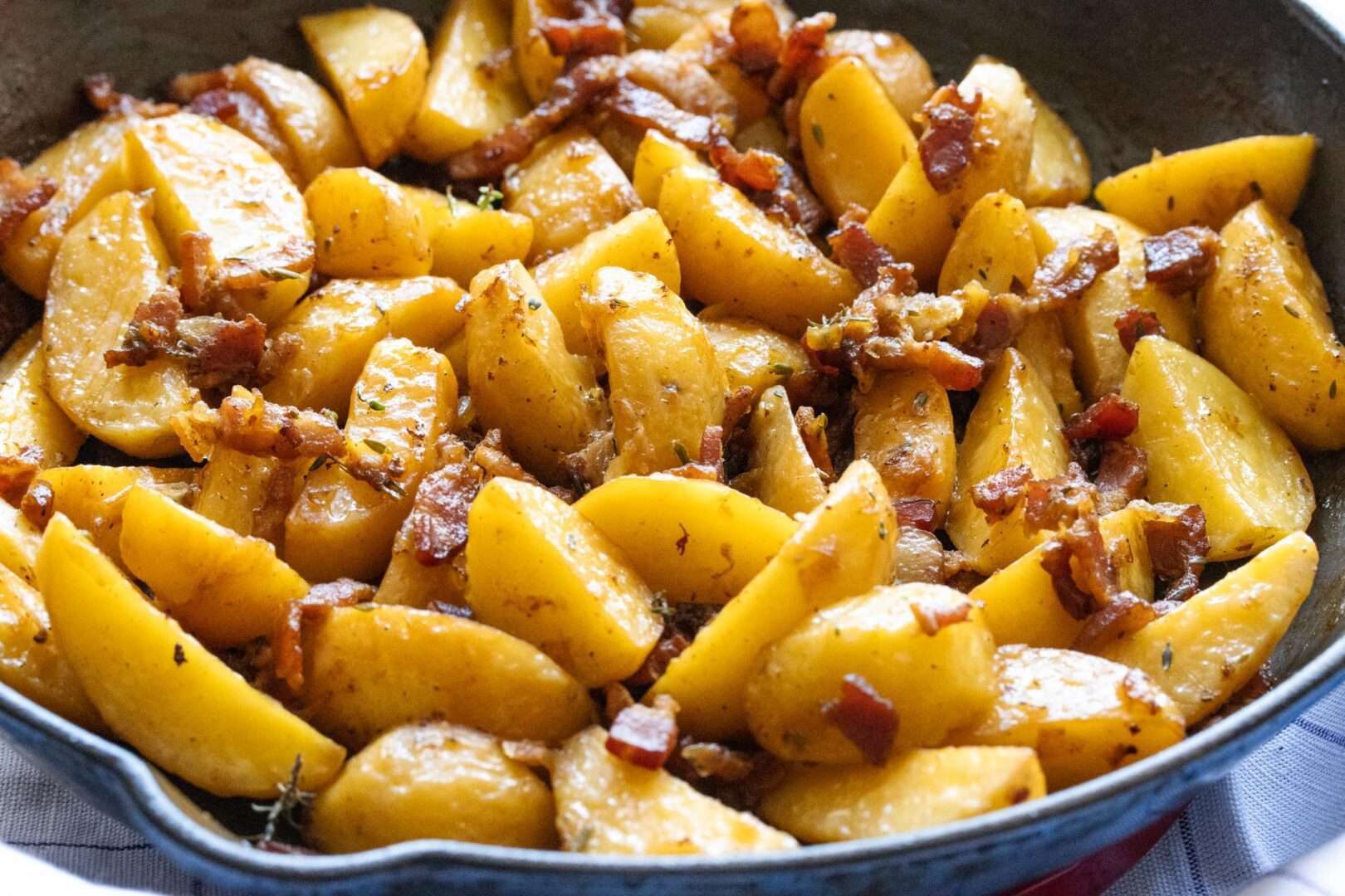 - Add the potatoes to the onions and fry, stirring occasionally for about 5 minutes or until the potatoes start to become golden. Add the drained bacon and the fresh thyme. Stir to blend.