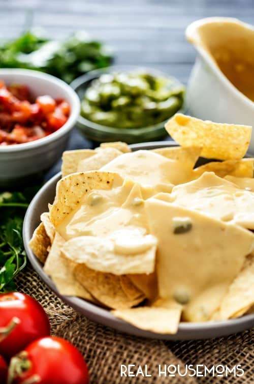 - Remove from heat, and pour onto chips, or into a bowl for dipping