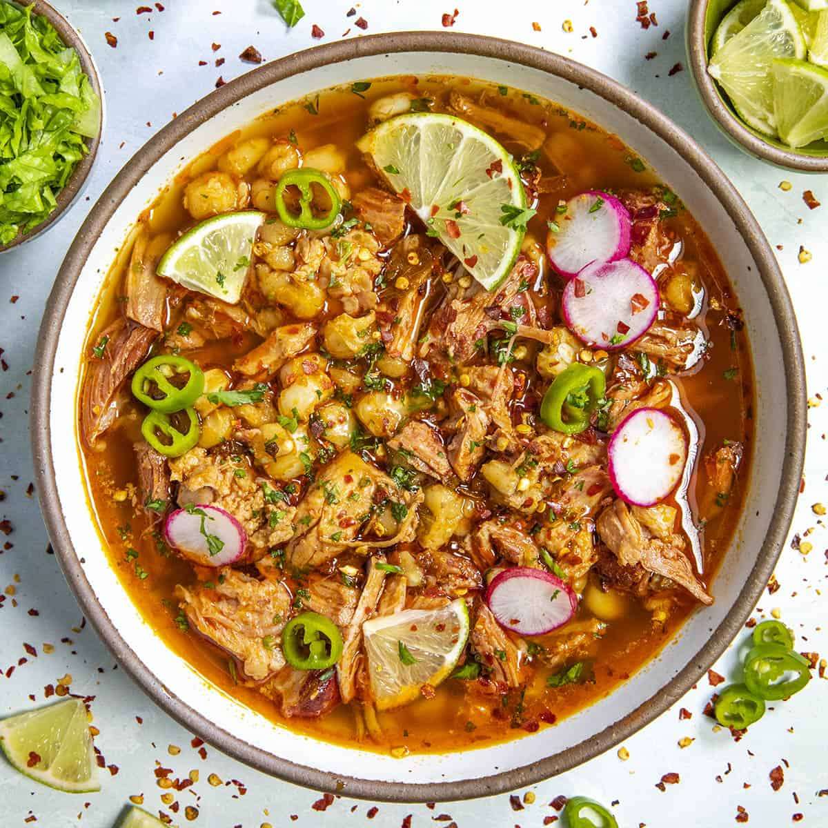 This pozole rojo recipe (posole) is the most comforting Mexican soup loaded with pork and hominy, spiced with vibrant red chilies and lots of toppings.