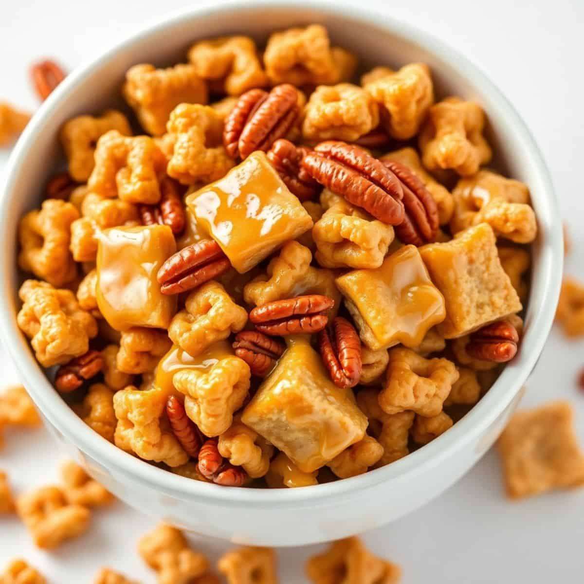Praline Crunch is a sweet, buttery snack made with crispy cereal, pecans, and a rich caramel coating. It's baked until golden and crunchy, creating an irresistible combination of sweetness and crunch. Perfect for gifting, snacking, or holiday treat platters!