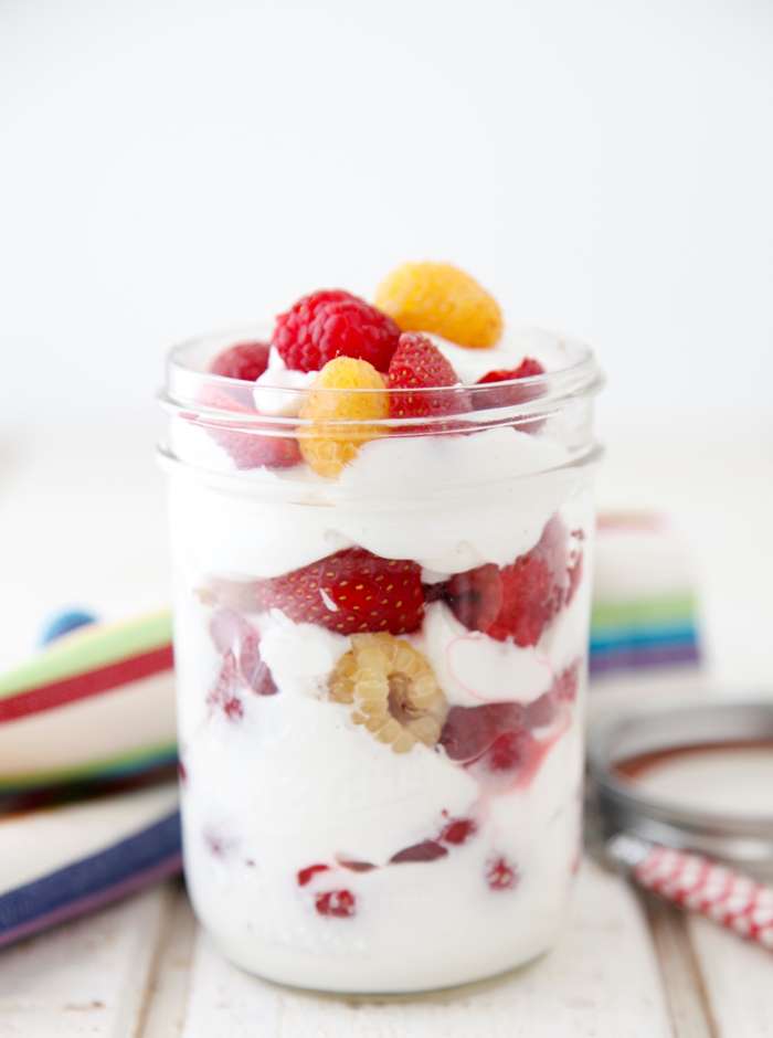 - Place 2 tablespoons plain yogurt in a mason jar, drizzle with honey, top with berries.