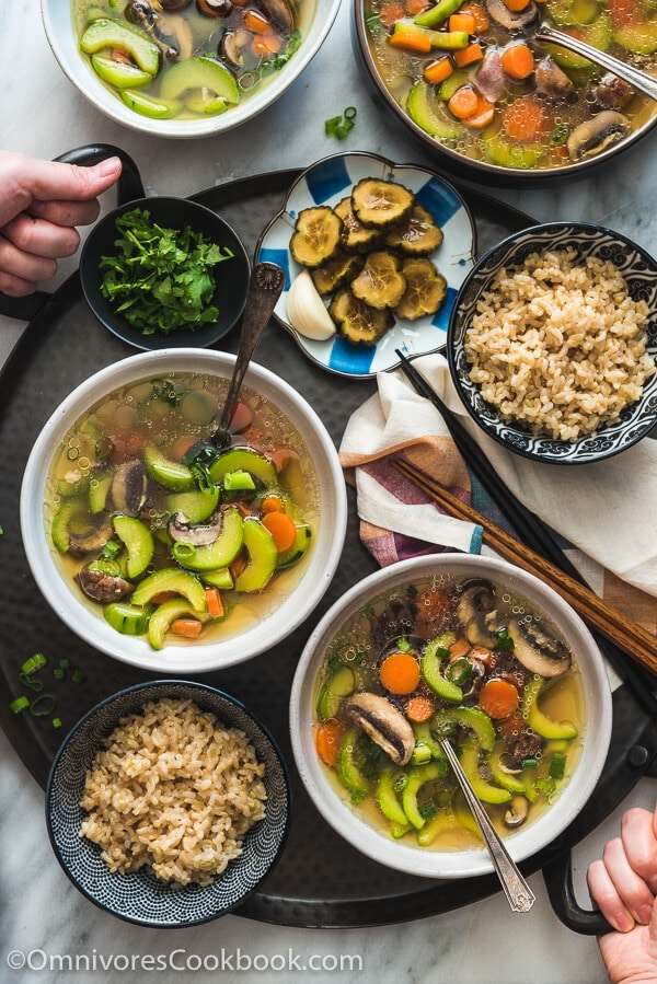 - Remove ginger and green onion from the soup and discard. If you’re using onion, leave the onions in the soup.