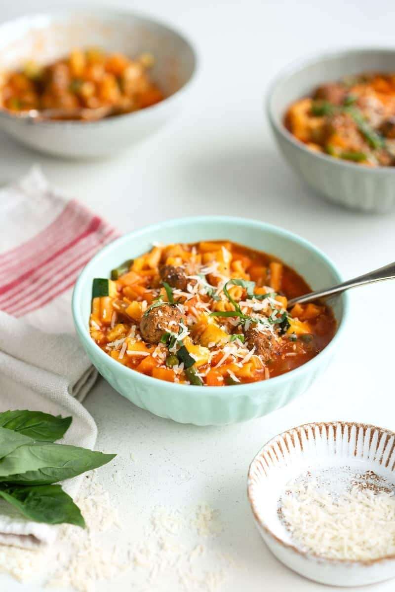 You are going to love this pressure cooker meatball minestrone! It takes minutes to prepare and it’s hearty, delicious and kid friendly too. Serve with plenty of grated Parmesan and fresh basil leaves or swirl some pesto over the top. Yum!