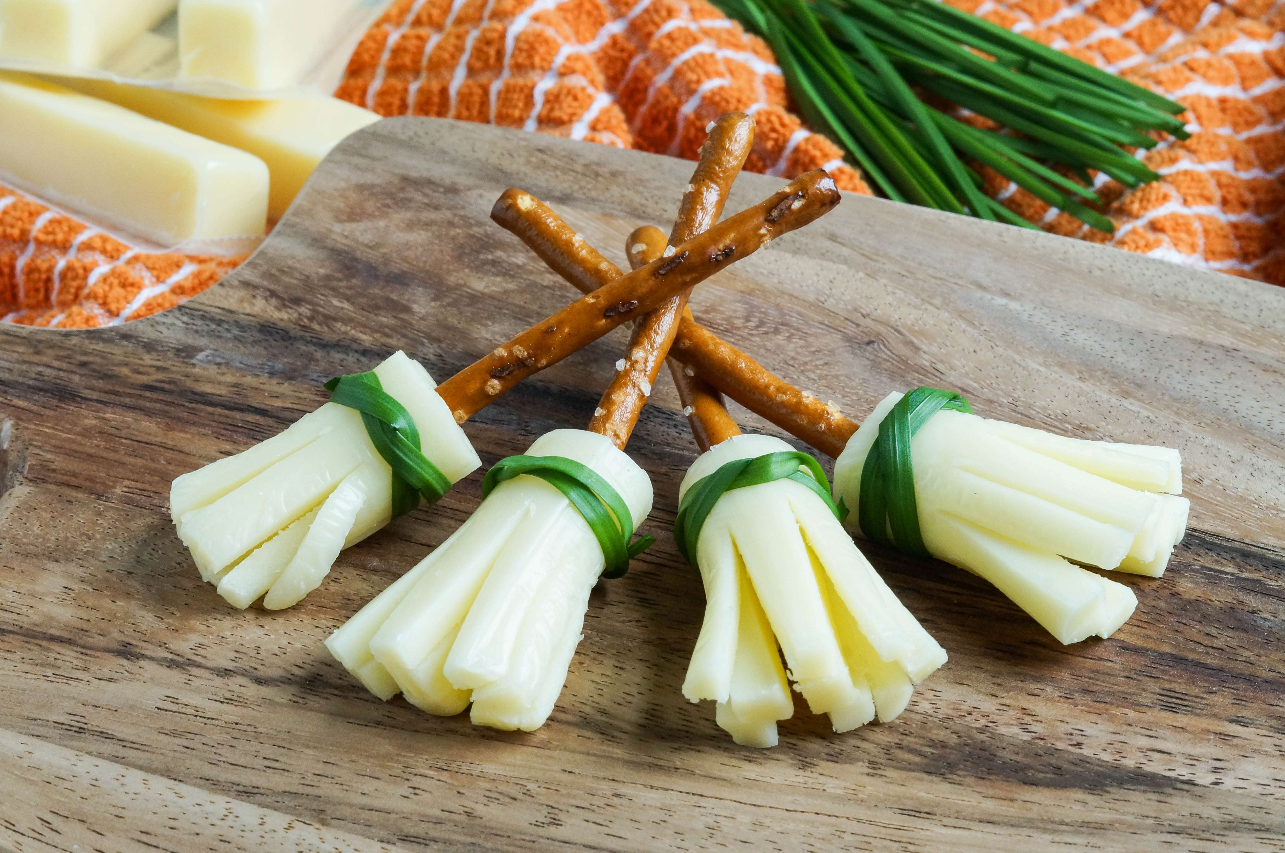 A recipe for Pretzel Broomsticks! These broomsticks come together with simply pretzel sticks, string cheese, and chives for an easy and fun Halloween snack.