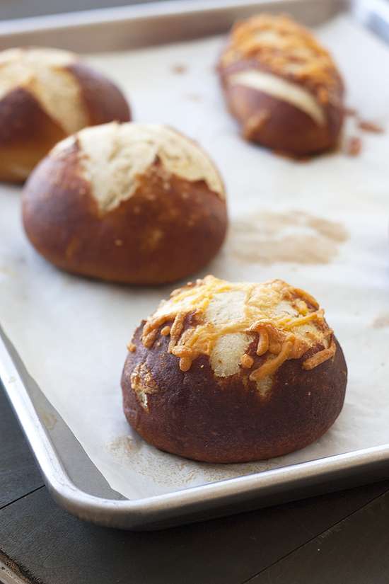 - Bake for about 20 minutes, or until the pretzel buns develop dark caramel color on the outsides. Remove the buns from the oven and let them cool on a cooking rack, loosely covered with a kitchen towel.